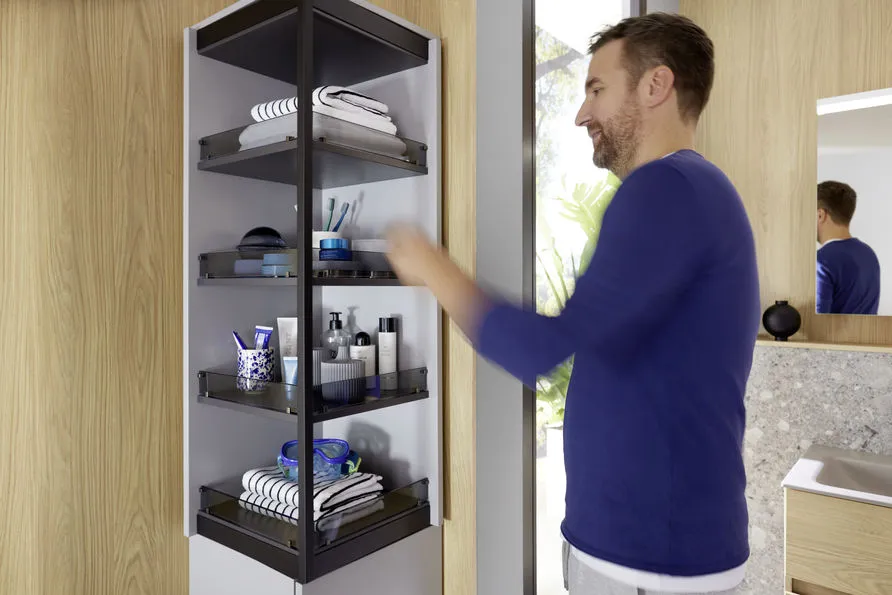 Der MagicTwist ist ein cleveres 2-in-1-Möbelstück, das durch eine einfache Drehbewegung flexibel zwischen einem geschlossenen Schrank und einem offenen Eckregal wechselt. Diese innovative Lösung optimiert den vorhandenen Platz und bietet zusätzlichen Stauraum, ideal für kleine Bäder oder Ecken, die optimal genutzt werden sollen. Der elegante Mechanismus kombiniert modernes Design mit praktischer Funktionalität und fügt sich nahtlos in jedes Badkonzept ein, ohne Kompromisse beim Stil einzugehen.