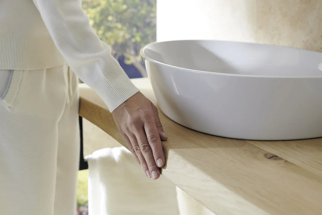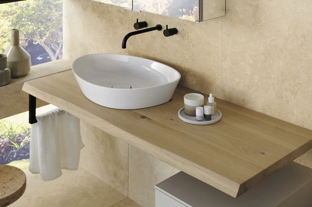 Massivholz bringt Wärme und Natürlichkeit ins Bad. Die Platten, erhältlich in heller und dunkel gebeizter Eiche, überzeugen mit einer natürlichen Baumkante und lassen sich perfekt mit Waschtischen und Badmöbeln kombinieren. sys30 setzt bei Konsolen und Platten stark auf individuelle Maße und natürliche Anmutung. Sie verleihen dem Badezimmer einen eleganten, harmonischen Akzent und sorgen für eine edle, zeitlose Ausstrahlung.