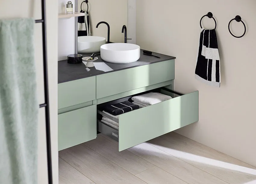 Die sys30-Serie bietet eine Vielzahl an Zubehör, das das Bad vervollständigt. Dazu gehören elegante Handtuchhalter, funktionale Ablagen und Seifenhalter, die nicht nur praktisch sind, sondern auch den Stil des Bades unterstreichen. Die Zubehörteile sind farblich auf die Möbel abgestimmt und tragen zu einem stimmigen Gesamtbild bei.