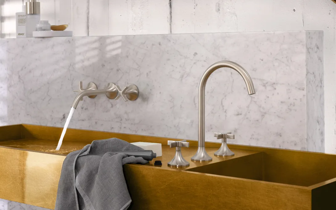 Die Serie Vaia verkörpert eine weiche, ausgewogene Formensprache und eine Grundhaltung, die stets offen gegenüber Neuem ist. Ihr filigraner Auslauf greift eine klassische Form auf und überführt diese in eine neue, offene Silhouette. Die ebenso klassisch anmutenden Griffe – verfügbar als Kreuzgriffe oder Hebel - verbinden geometrische mit weichen Konturen. Dazu schaffen konische Rosetten einen besonders sanften Übergang zum Waschtisch.